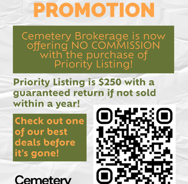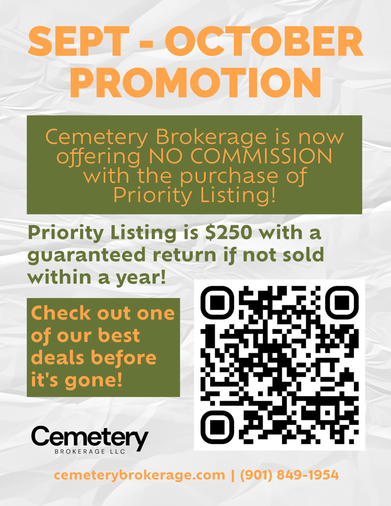 Cemetery brokerage has low fees with no hidden charges or recurring payments. Your property is listed until sold with a low commission once a buyer is confirmed and payment made.